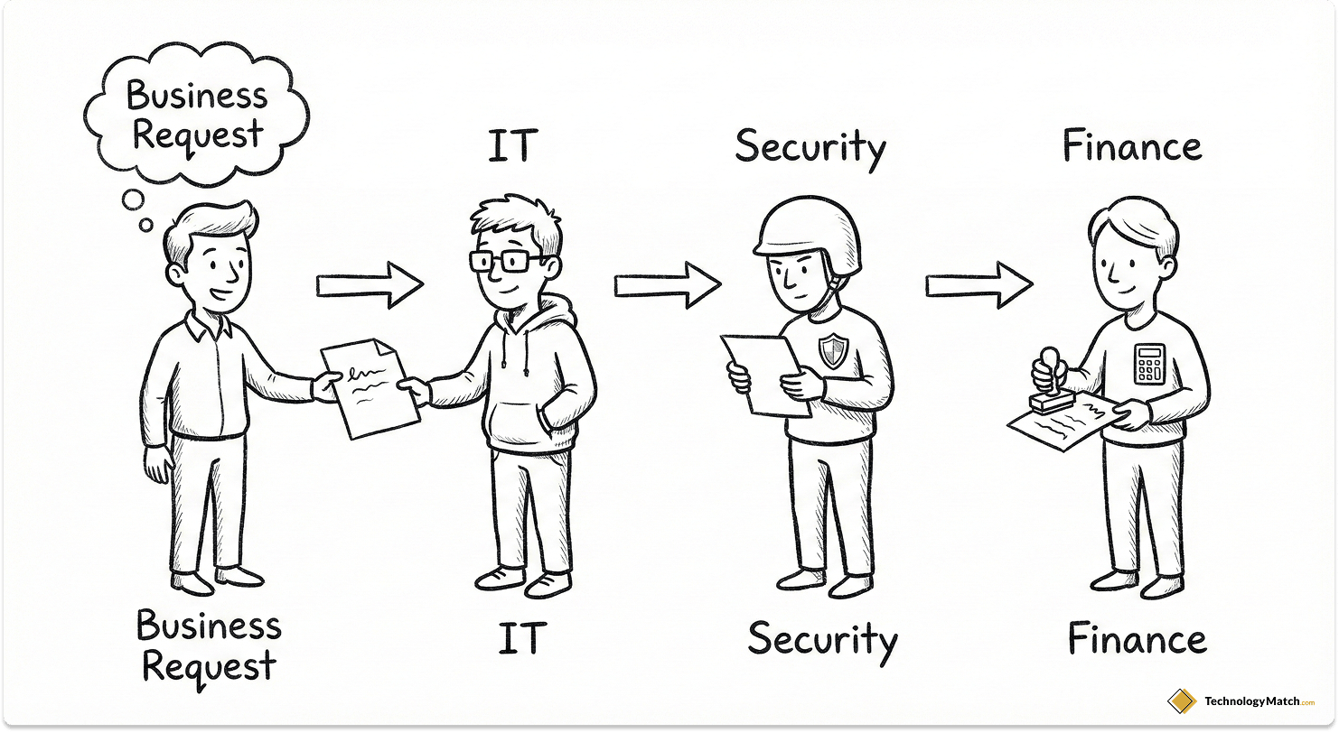 First, the business unit submits an intake form detailing the exact business problem, the required capabilities, and the proposed budget. Next, IT reviews the request to ensure the tool aligns with the current enterprise architecture and checks the existing catalog to see if an internal solution already exists.