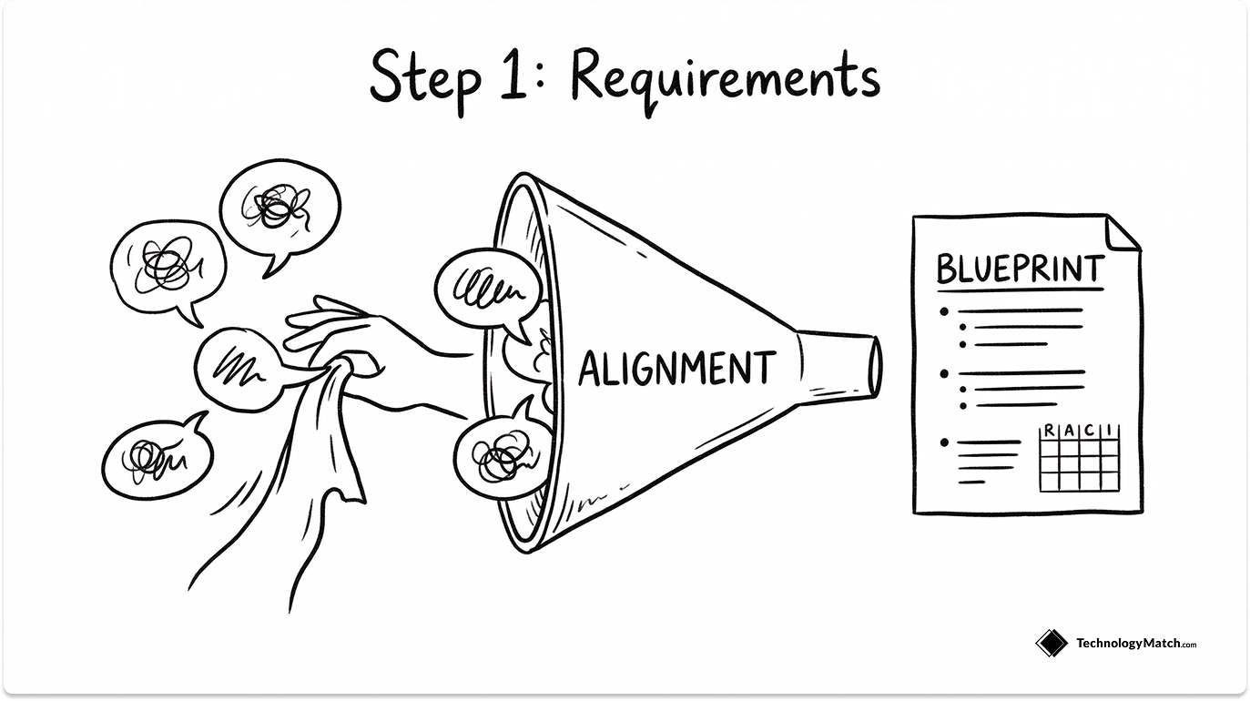 Align stakeholders and decision rights. Establish a cross‑functional RACI (IT, Security, Procurement, Legal, Finance, business owners), define scoring responsibilities, and agree on when to pilot versus award directly. Document everything in a brief BRD with success metrics, a target TCO model, and a change‑control approach.