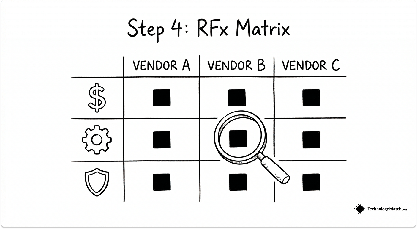 The scorecard serves two purposes: it forces internal alignment on what actually matters before vendors respond, and it gives you a defensible audit trail for the award decision.